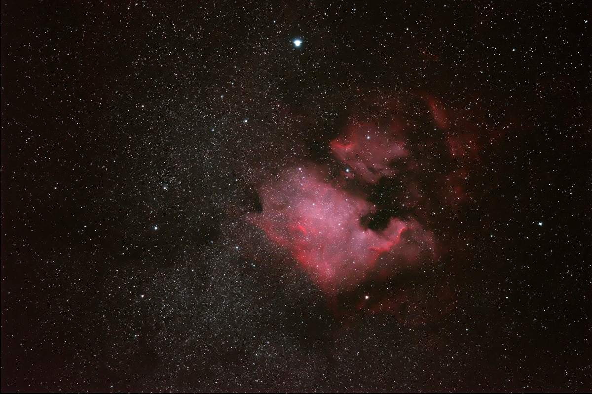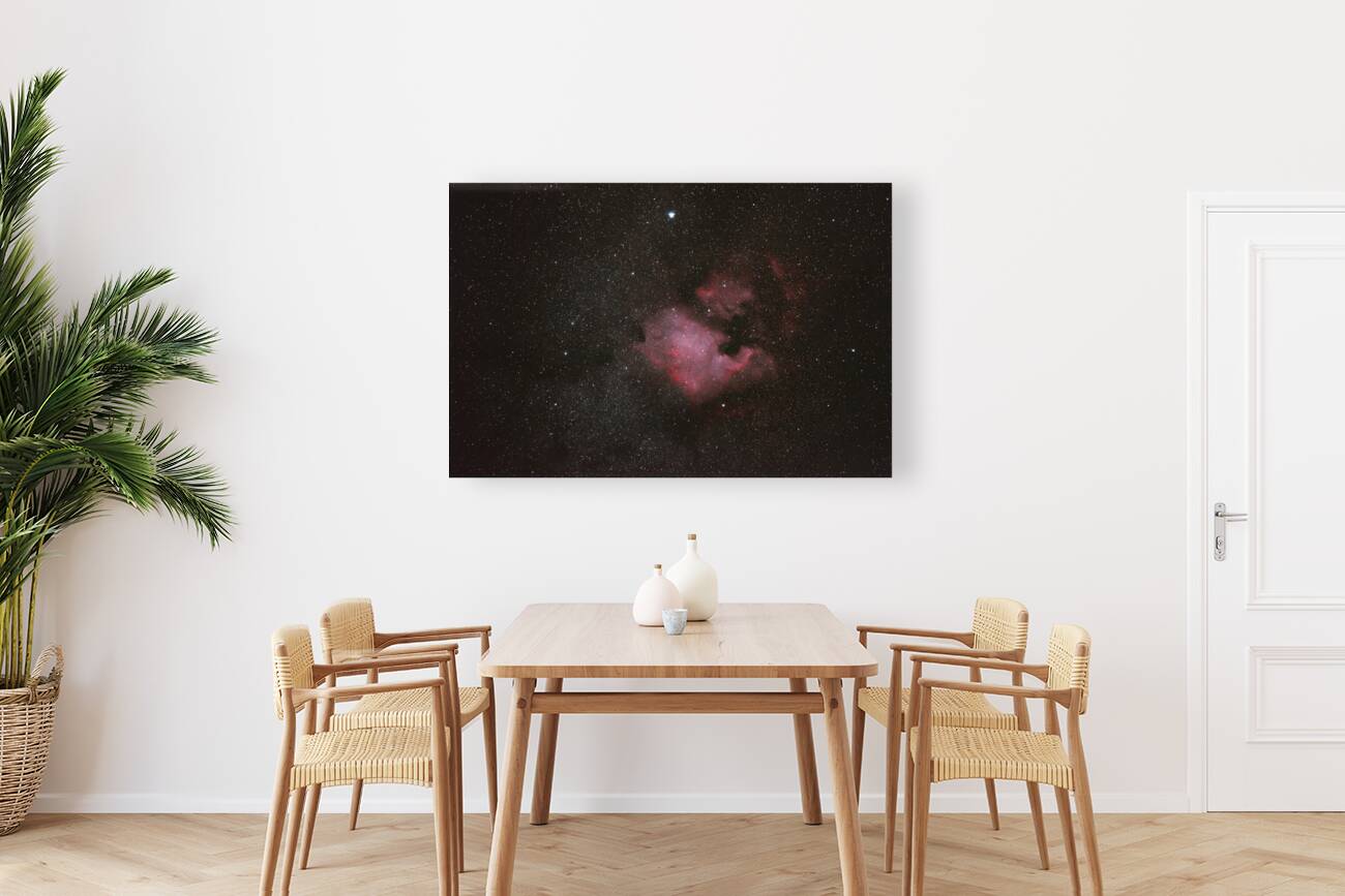 In the cosmic canvas, a vibrant nebula unfolds. A tapestry of swirling gases and dust, painted with pinks, magentas and reds illuminated by the distant glow of nearby stars and intense radiation. Nebulas can give birth to stars and planetary systems. This nebula is known as "The North American Nebula" due to its shape resembling the continent.