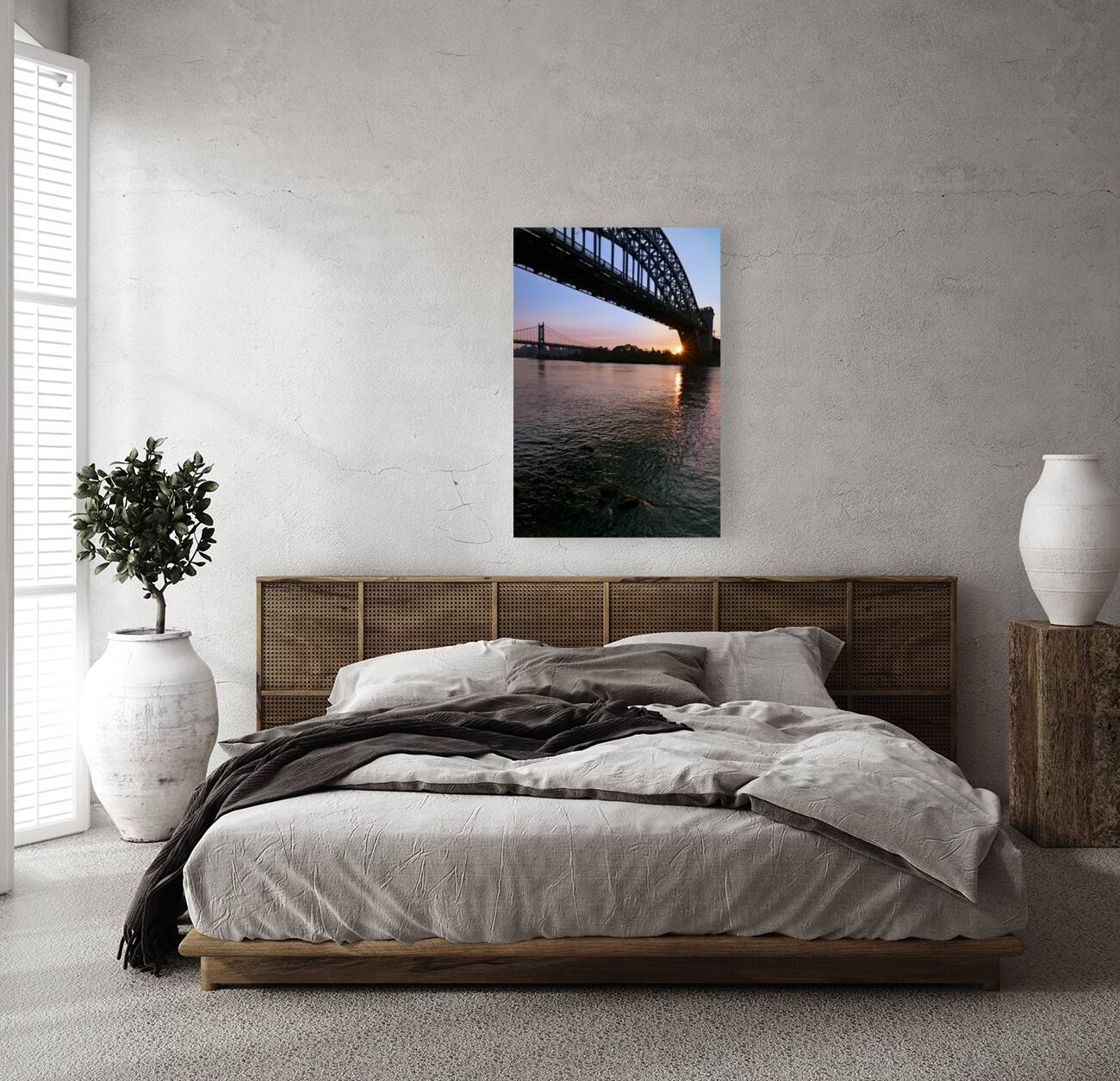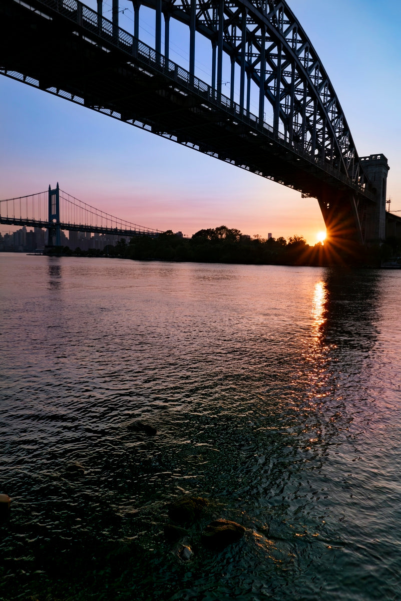 A stunning sunset between the Triboro and Hellsgate Bridge in Astoria Queens with the water below reflecting the breathtaking hues of the sky .
