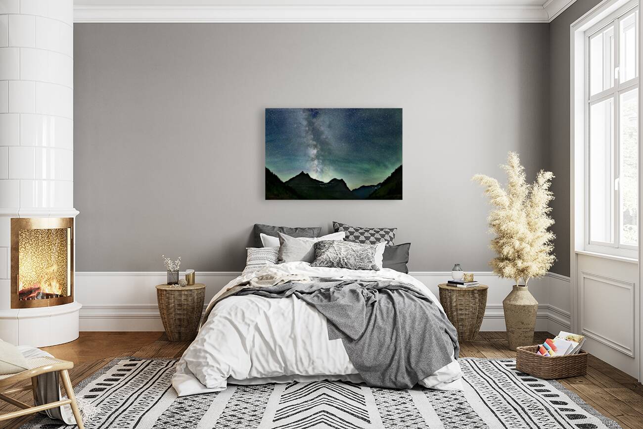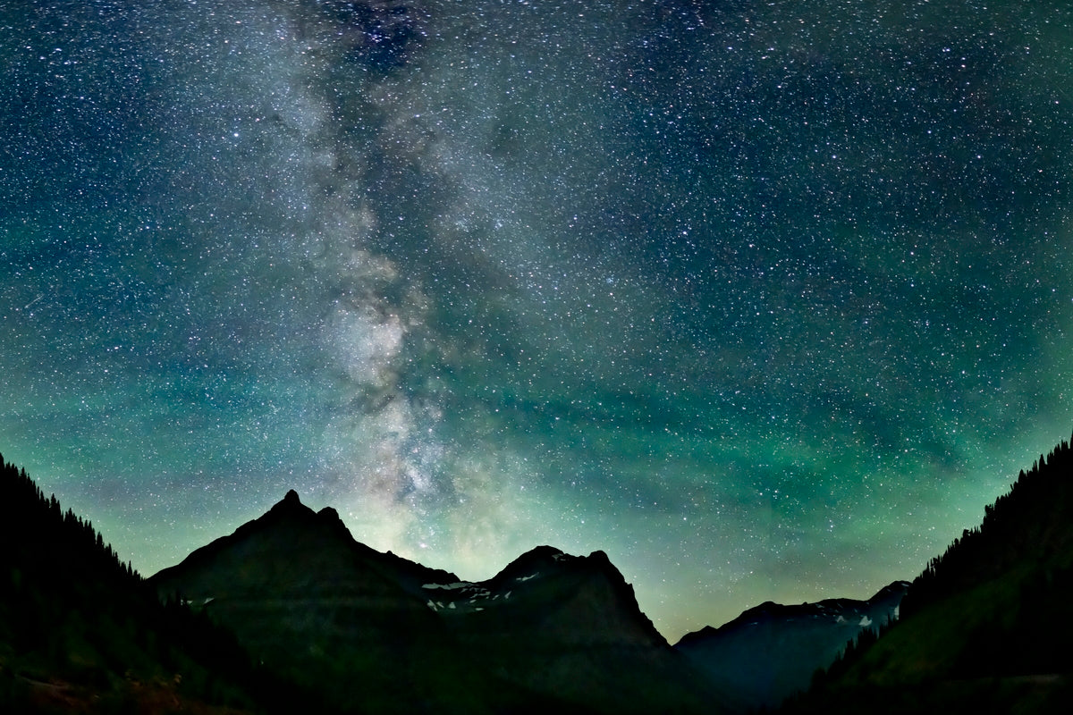 At Logans Pass in Montana, the Milky Way stretches across the horizon, intertwining with a myriad of stars. The celestial display is enhanced by the vibrant air glow, painting scene with a captivating cosmic palette.